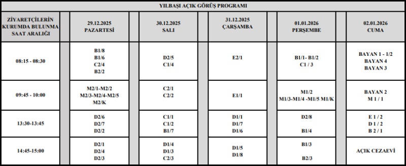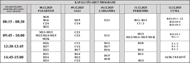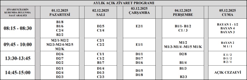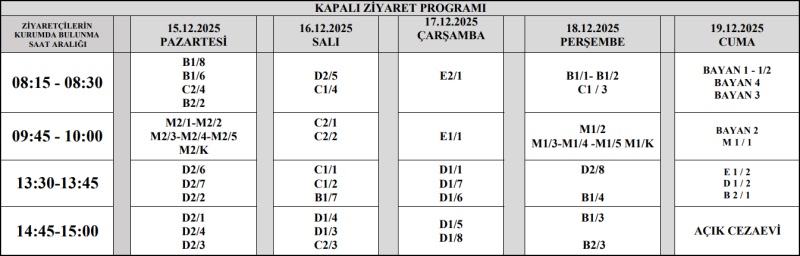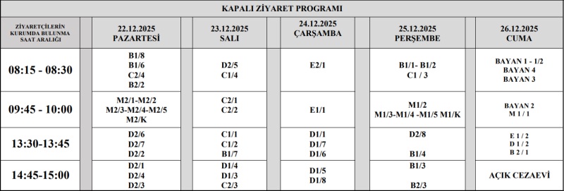 1. ZİYARET PROGRAMI 01.12.2025 PAZARTESİ İLE 02.01.2026 CUMA TARİHLERİ ARASI İÇİN GEÇERLİDİR. ZİYARET SAATLERİ AYLIK OLARAK DEĞİŞTİRİLMEKTEDİR.